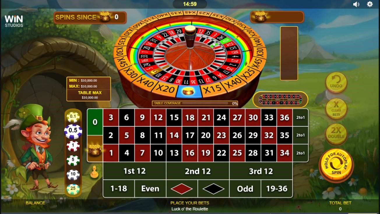 Luck O’ The Roulette is a fixed odds betting game based on roulette. The Roulette wheel has 38 numbered slots (0 to 36 and a Pot bet), each of which can be bet on. The wheel is spun in one direction and a ball is spun in the wheel in the opposite direction. The ball will land in one of the numbered slots or in the pot bet slot. If you bet on the slot the ball has landed in, you will win a payout.
